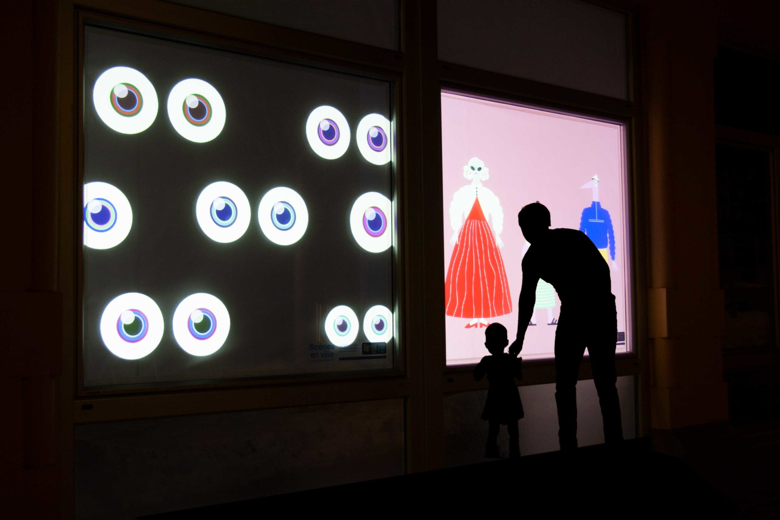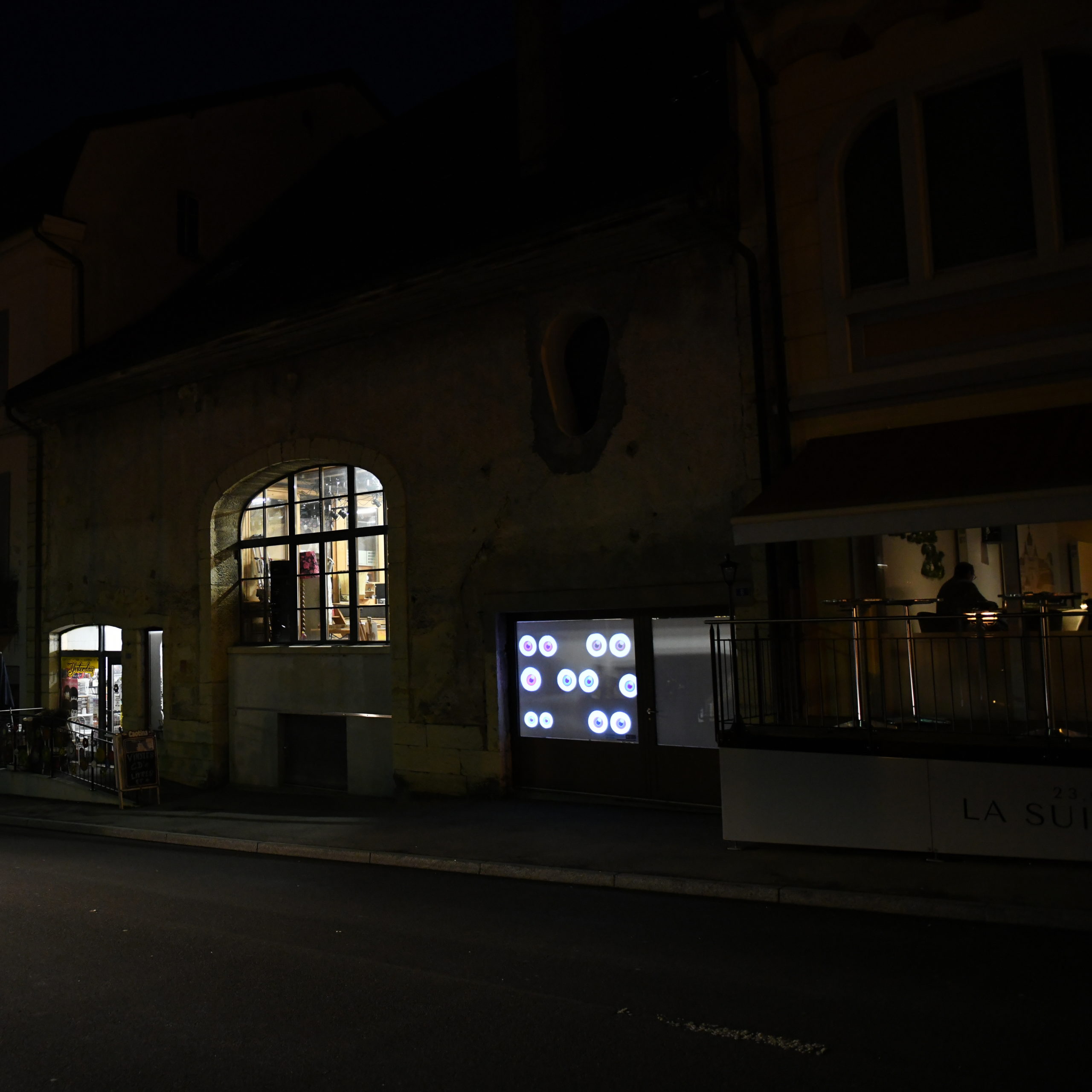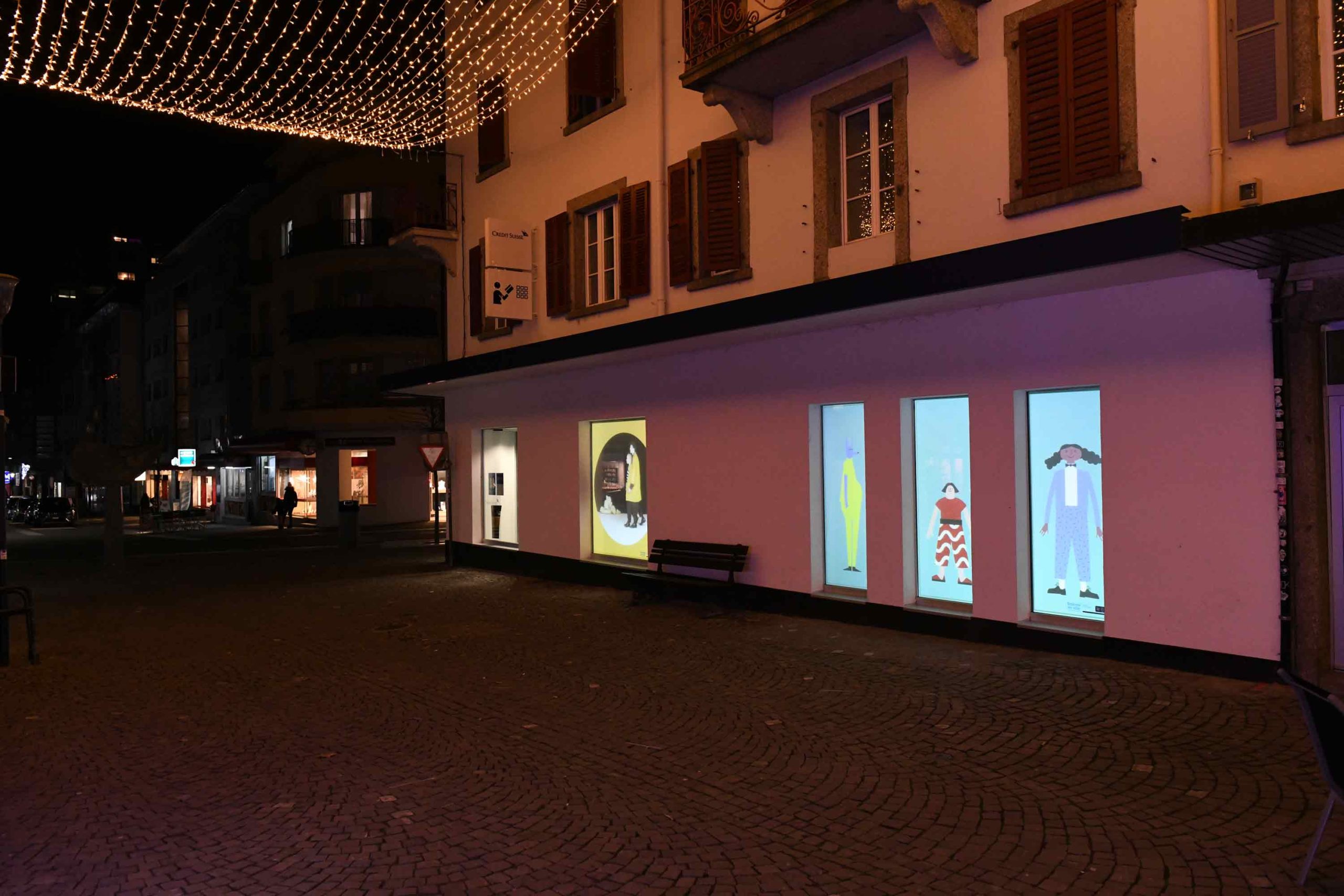 Scènes en ville – imaginé avec Léa Debernardi et créé en partenariat avec le Centre Culturel du District de Porrentruy – transforme six vitrines du centre-ville en espaces de projection dédiés aux arts de la scène. Ce parcours nocturne, également présenté à Monthey et La Chaux-de-Fonds, investit des vitrines vacantes comme lieux d’exposition. Né durant la pandémie pour pallier la fermeture des lieux culturels, le projet vise à soutenir les artistes et à proposer une nouvelle forme de médiation. Les projections ont été réalisées avec la participation de l’écrivaine Elisa Shua Dusapin ①, des comédiens Adrien Borruat et Larissa Wagenhals (Mario&Mela) avec le vidéaste Gaspard Gigon ②, de l’illustratrice Anja Wicki ③, de la designer Léa Debernardi ainsi que de moi-même ④ ⑤ ⑥.